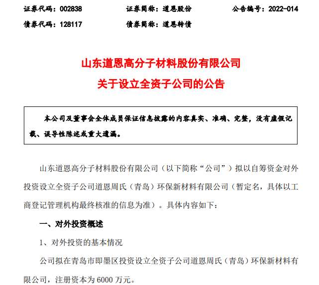 同日,公司还发布公告称,为保证生物降解材料项目的投资建设及运营管理,公司拟在青岛市即墨区投资设立全资子公司道恩周氏(青岛)环保新材料有限公司,注册资本为 6000 万元。下属子公司实施上述项目的投资、建设和运营。
