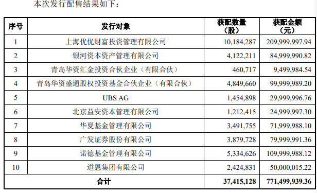 道恩股份7月7日公布非公开发行股票发行情况报告书,本次发行最终获配的发行对象共计10名,发行价格为20.62元/股,发行股数37,415,128股,募集资金总额7.71亿元。其中,上海优优财富投资管获配金额约2.1亿元,银河资本、诺德基金、广发证券等机构参投。