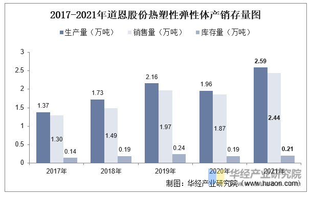 2021年,道恩股份的热塑性弹性体生产量为2.59万吨,同比增长32.27%;热塑性弹性体的销售量是2.44万吨,同比增长30.76%;库存量(0.21万吨)则是较上年增长6.92%。