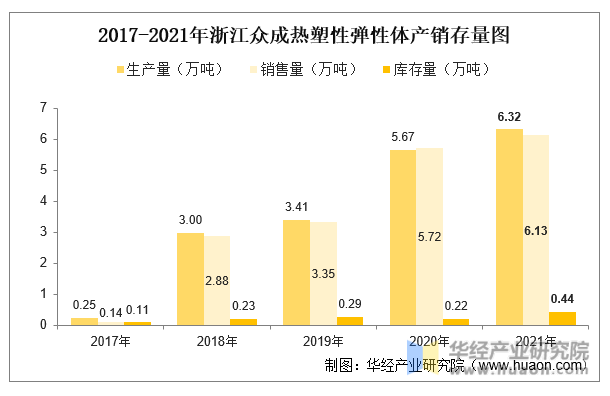 2021年,浙江众成的热塑性弹性体生产量为6.32万吨,同比增长11.51%;热塑性弹性体的销售量(6.13万吨)则是较上年增长7.20%;库存量是0.44万吨,同比增长达98.47%。