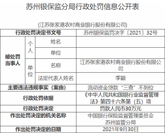 银保监会网站近日发布苏州银保监分局行政处罚信息公开表(苏州银保监罚决字〔2021〕32号),江苏张家港农村商业银行股份有限公司(以下简称“张家港行”,股票代码002839.SZ)存在流动资金贷款“三查”不到位的违法违规事实,银保监会苏州监管分局对其作出罚款人民币30万元的行政处罚,依据为《中华人民共和国银行业监督管理法》第四十六条第(五)项。