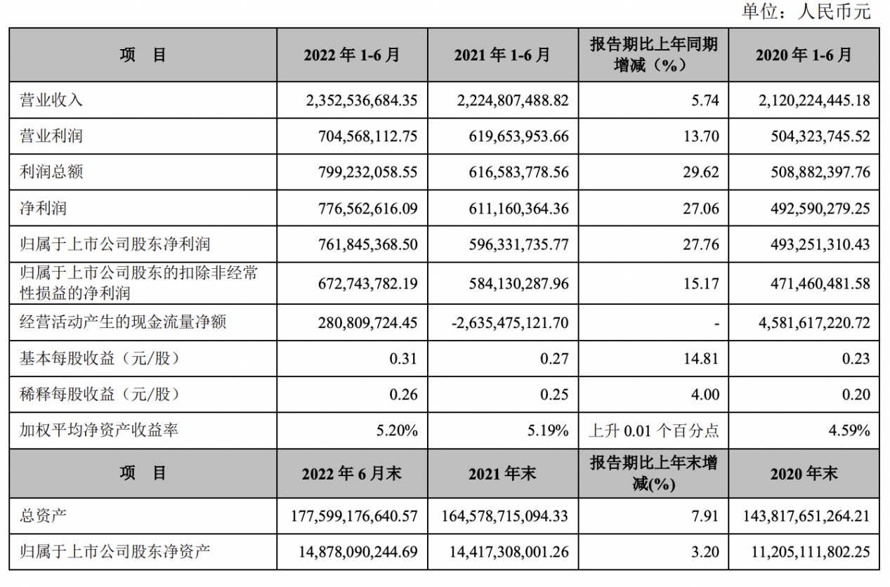 报告显示,2022年上半年,张家港行营业收入23.53亿元,同比增长5.74%;归属于上市公司股东的净利润7.62亿元,同比增长27.76%;归属于上市公司股东的扣除非经常性损益的净利润6.73亿元,同比增长15.17%;基本每股收益0.31元。
