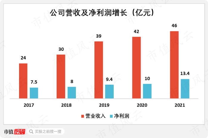 2017-2021年,公司的营收由24亿元增至46亿元,CAGR为18%,净利润由7.5亿元增至13.4亿元,CAGR为16%,盈利与收入均保持较快增长。