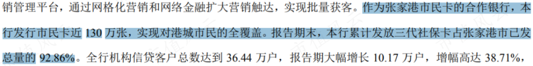 有一个数据可以反映公司在当地居民生活中的渗透程度:截至2021年末,公司作为张家港市民卡的合作银行,累计发放的第三代社保卡占张家港市发卡总量的93%。