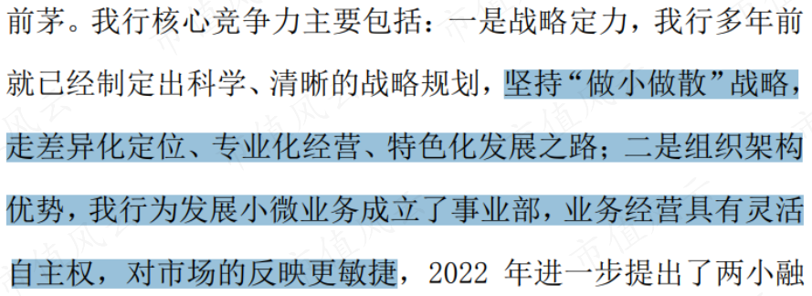 结合自身的特点和能力,公司很早就将“三农两小”(两小指小微金融和社区金融)确立为业务方向,坚持“做小做散”。