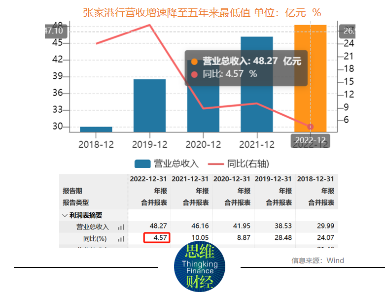 不过,该行去年实现营业收入48.27亿元,同比增长4.57%,增速明显下滑,已降至近五年最低水平。2018年-2021年,张家港行营收增速分别为24.07%、28.48%、8.87%、10.05%。