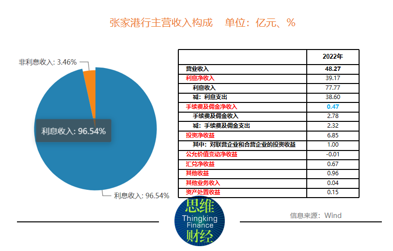 相比较下,非利息收入却由9.25亿元降至9.11亿元,其中投资收益为6.85亿元,同比增长8.08%,值得一提的是,2022年,张家港行手续费及佣金净收入为4667.99万元,同比减少62.43%。