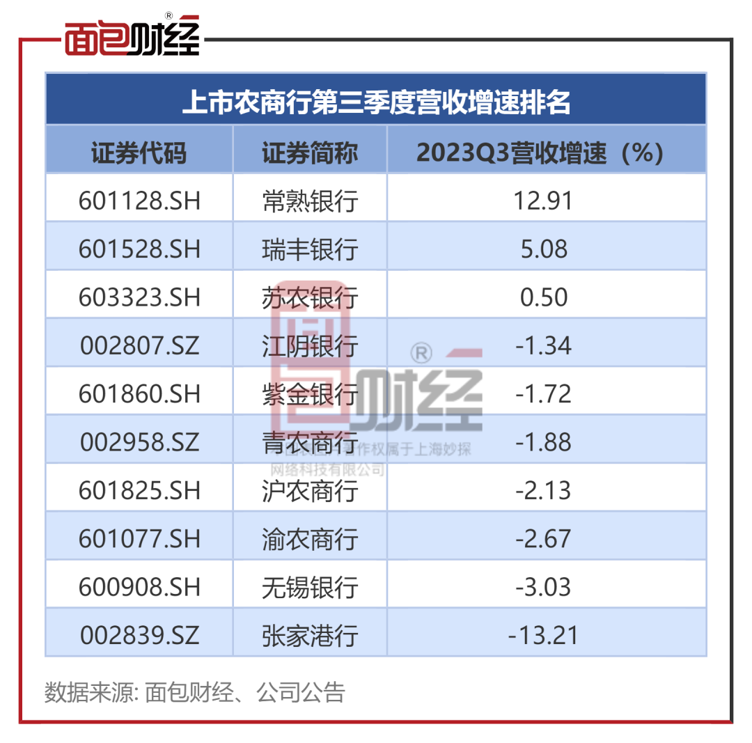截至目前,上市农商行均已披露三季报。值得关注的是,张家港行第三季度的营收增速垫底上市农商行。