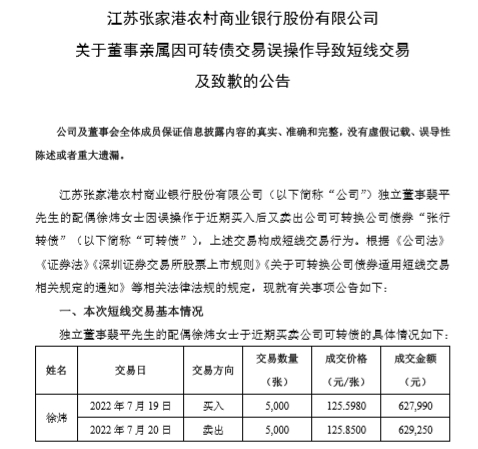 据报道,该行独立董事裴平的配偶徐炜于10月14日买入1060张张行转债,成交金额11.62万元,又于当天卖出450张,成交金额4.93万元,构成短线交易行为。张家港行在公告中称,徐炜是在证券交易中,误将代码“123048”错输为“128048”,因此导致本次短线交易。另外,徐炜本次误操作产生的收益为13.95元。