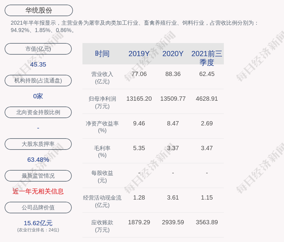 2021年半年报显示,华统股份的主营业务为屠宰及肉类加工行业、畜禽养殖行业、饲料行业,占营收比例分别为:94.92%、1.85%、0.86%。
