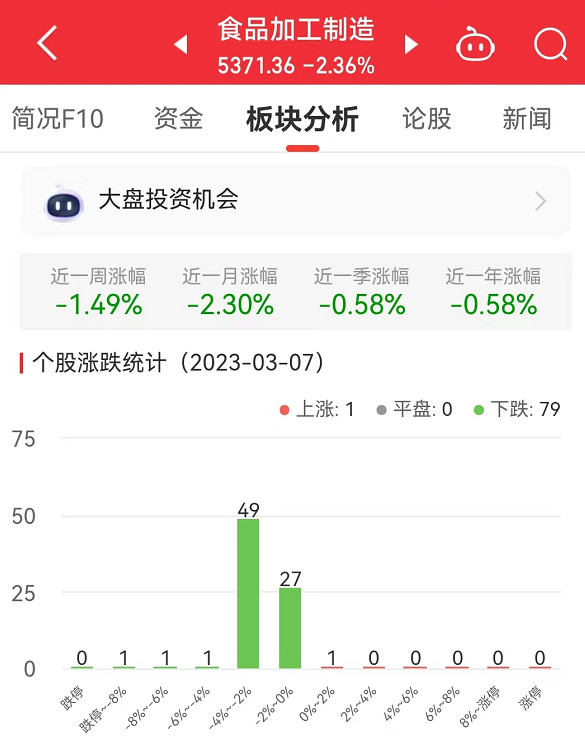 中国经济网北京3月7日讯今日,食品加工制造板块整体跌幅2.36%,其中,1只股票上涨,79只股票下跌。