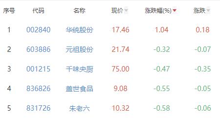绝味食品、煌上煌、佳禾食品、熊猫乳品、劲仔食品、五芳斋位列涨幅榜后五位,涨幅分别为-8.22%、-6.06%、-4.55%、-4.00%、-3.85%、-3.85%。