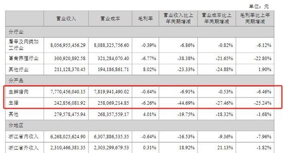从产品端看,华统股份来自生猪鲜肉产品的收入高达77.7亿元,占营收的90.58%,而生猪、生鲜禽肉、火腿、饲料、其他产品的占比合计不足10%。同时,公司生鲜猪肉产品毛利率为-0.64%,生猪毛利率为-6.26%,均有不同程度的下滑。