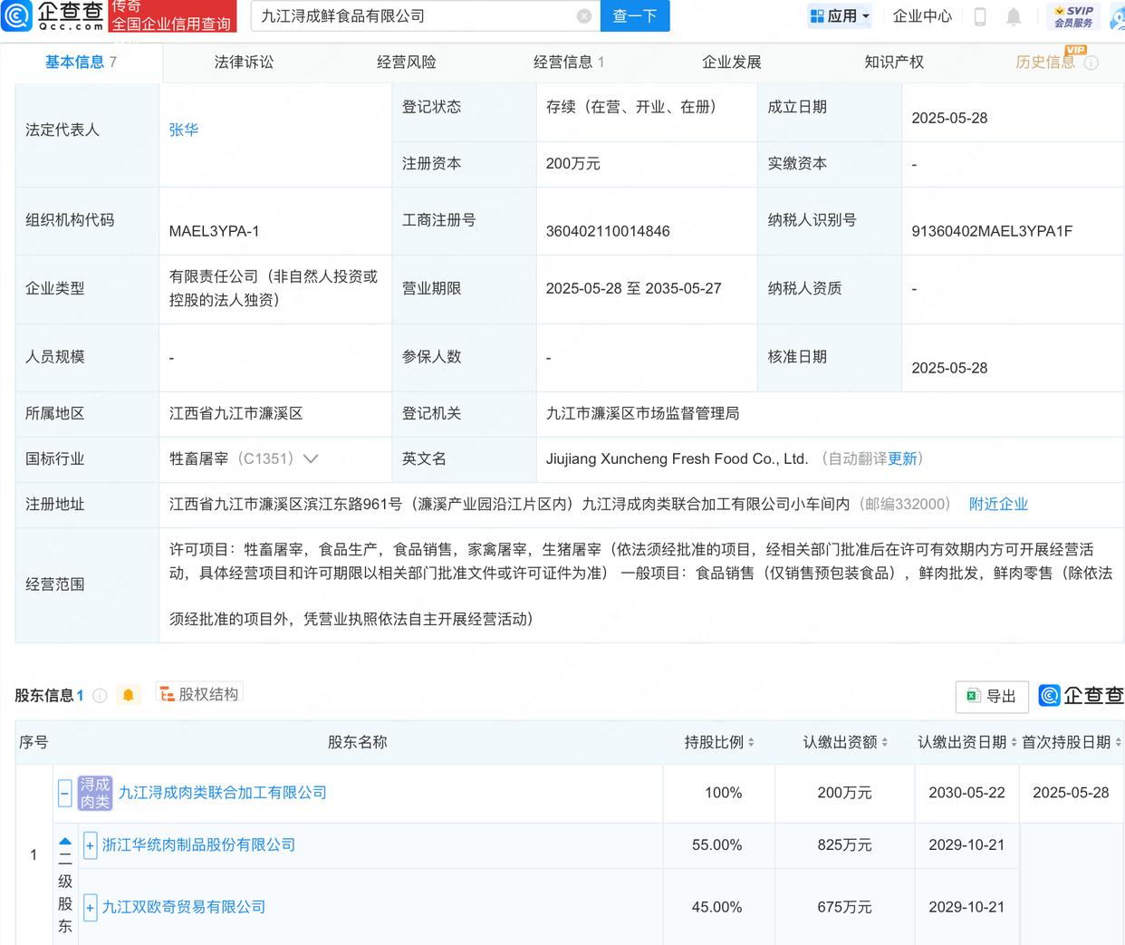 近日,九江浔成鲜食品有限公司成立,法定代表人为张华,注册资本200万元,经营范围包含:牲畜屠宰,食品生产,食品销售,家禽屠宰,生猪屠宰等。该公司由华统股份(002840)旗下九江浔成肉类联合加工有限公司全资持股。