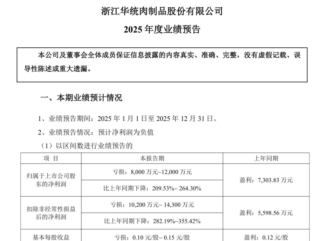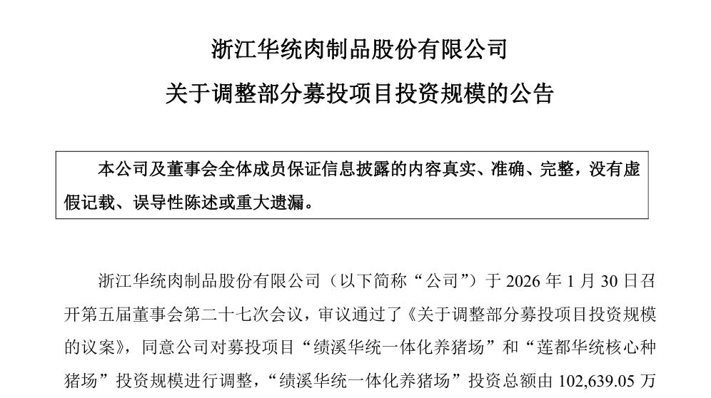 1 月 30 日,华统股份同步披露两则重磅公告:一方面发布业绩预告:预计 2025 年度归母净利润将出现 8000 万元至 1.2 亿元的亏损,较上年同期盈利 7304 万元骤降 209.53%至 264.30%,业绩由盈转亏的同时,项目投资策略也迎来大幅收缩。另一方面对两大生猪养殖募投项目进行重大投资调整,合计缩减资金超 7.7 亿元。