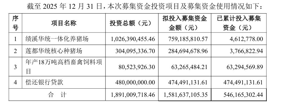 回溯资金来源,2025 年 4 月,华统股份完成向特定对象发行股票,募集资金约 16 亿元,净额约 15.8 亿元,专项用于上述两大生猪养殖项目及其他经营用途。截至 2025 年 12 月 31 日,该部分募集资金在项目上已累计投入约 5.46 亿元。此次项目投资调整后,将形成约 4.83 亿元的节余资金,公司表示将围绕主业谨慎论证新的投资方向。