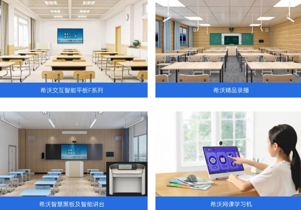 在数字化教育应用和服务平台方面,有希沃白板(教学信息化工具)、希沃信鸽(教研信息化系统)、希沃集控(物联管理系统)、希沃学苑(教师专业发展服务平台)等产品。