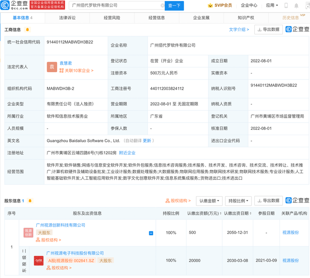 APP显示,近日,广州佰代罗软件有限公司成立,法定代表人为袁慧君,注册资本500万元人民币,经营范围包含:大数据服务;物联网技术研发;人工智能基础软件开发;数字文化创意软件开发等。股权穿透显示,该公司由视源股份(002841)间接全资控股。