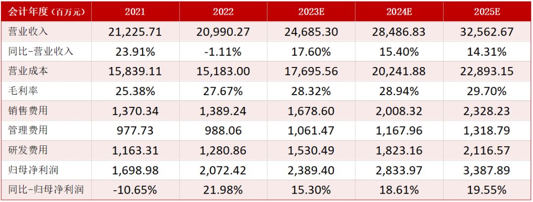 基于以上假设,我们对公司2023年-2025年整体经营业绩预测简表如下: