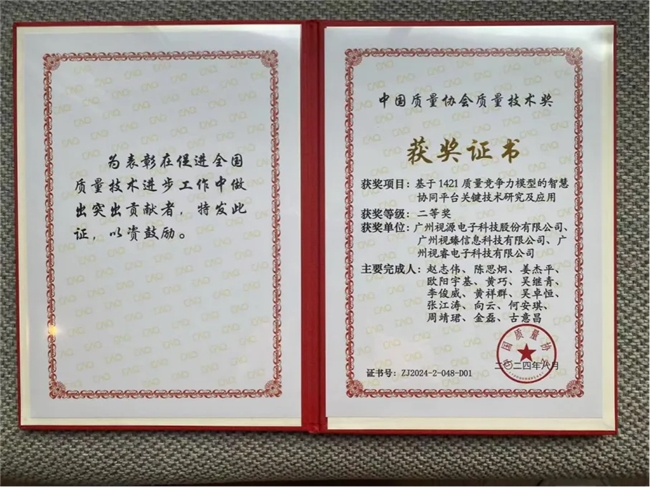 此前,视源股份申报项目《基于451质量竞争力模型的智慧协同平台关键技术研究及应用》获评广东省质量协会技术奖一等奖,彰显了其在质量技术创新领域的实力。而此次两个项目获得中国质量协会质量技术奖,是视源股份长期坚持技术创新、注重产品质量与社会效益的结果。