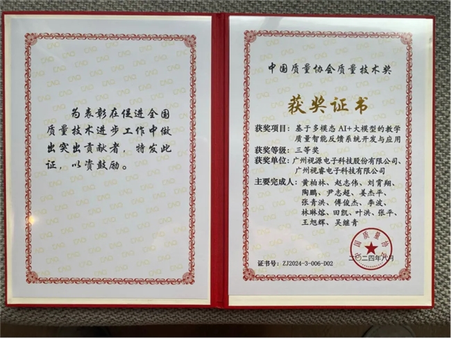 近日,2024年度全国质量技术奖揭晓,视源股份申报的技术成果《基于1421质量竞争力模型的智慧协同平台关键技术研究及应用》荣获二等奖,另一技术成果《基于多模态AI+大模型的教学质量智能反馈系统开发与应用》则荣获三等奖。中国质量协会质量技术奖是2005年经国家科技部、国家科技奖励办公室批准设立的科学技术奖项,以表彰在质量技术领域中做出突出贡献的单位或个人,是我国质量技术领域的最高荣誉。