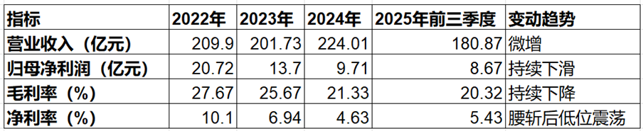 且2025年前三季度营收180.87亿元,同比增5.45%;归属于上市公司股东的净利润8.67亿元,同比降6.81%;扣非后净利润6.83亿元,同比更是下降20.95%。前三季度净利率仅5.43%,这一水平较2022年的10.1%近乎腰斩。
