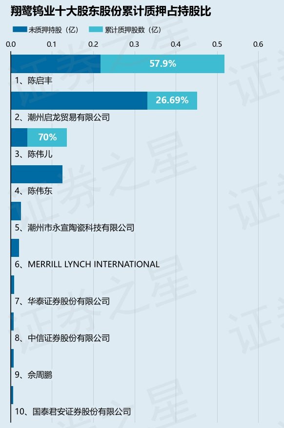 截止本公告日,股东陈启丰已累计质押股份3001.22万股,占其持股总数的57.9%,股东潮州启龙贸易有限公司已累计质押股份1206.6万股,占其持股总数的26.69%,股东陈伟儿已累计质押股份957.74万股,占其持股总数的70.0%。本次质押后翔鹭钨业(002842)十大股东的累计质押股份占持股比例见下图: