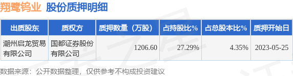 翔鹭钨业(002842)5月26日公开信息显示,股东潮州启龙贸易有限公司向国都证券股份有限公司合计质押1206.6万股,占总股本4.35%。质押详情见下表: