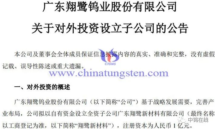 翔鹭钨业拟1亿元建设翔鹭新材料公告