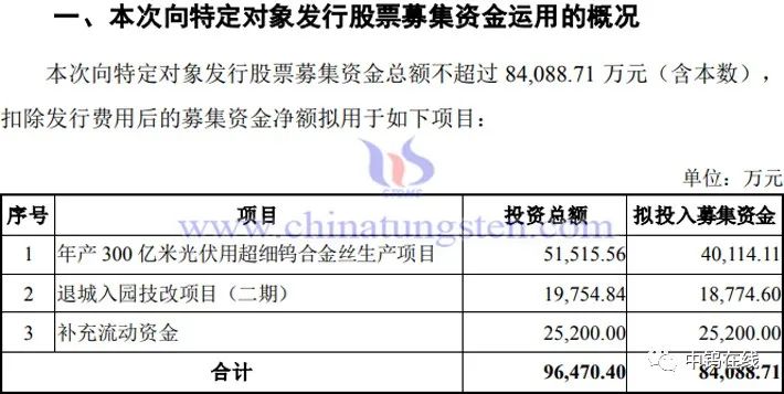 近日,翔鹭钨业发布公告称,公司向特定对象发行股票募集资金总额不超过84,088.71万元,扣除发行费用后的募集资金净额将用于年产300亿米光伏用超细钨合金丝生产项目40,114.11万元、退城入园技改项目(二期)18,774.60万元、补充流动资金25,200.00万元。值得一提的是,募集资金不足部分由公司以自有资金或通过其他融资方式解决。