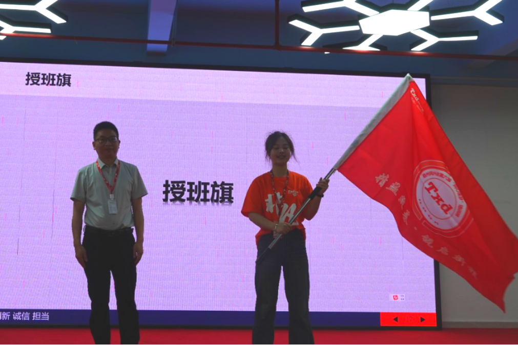 随后,综合管理中心总经理陈庆椿为第七届菁干班授班旗。班旗飘扬,象征着责任与使命的传递,也代表着第七届菁干班正式启航。在未来的日子里,菁干班将以班旗为指引,团结一心,共同奋进。典