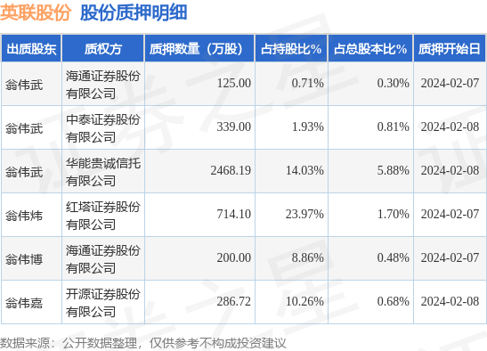 英联股份(002846)2月20日公开信息显示,股东翁伟武、翁伟炜、翁伟博、翁伟嘉向海通证券股份有限公司、中泰证券股份有限公司、华能贵诚信托有限公司、红塔证券股份有限公司、开源证券股份有限公司合计质押4133.02万股,占总股本9.85%。质押详情见下表: