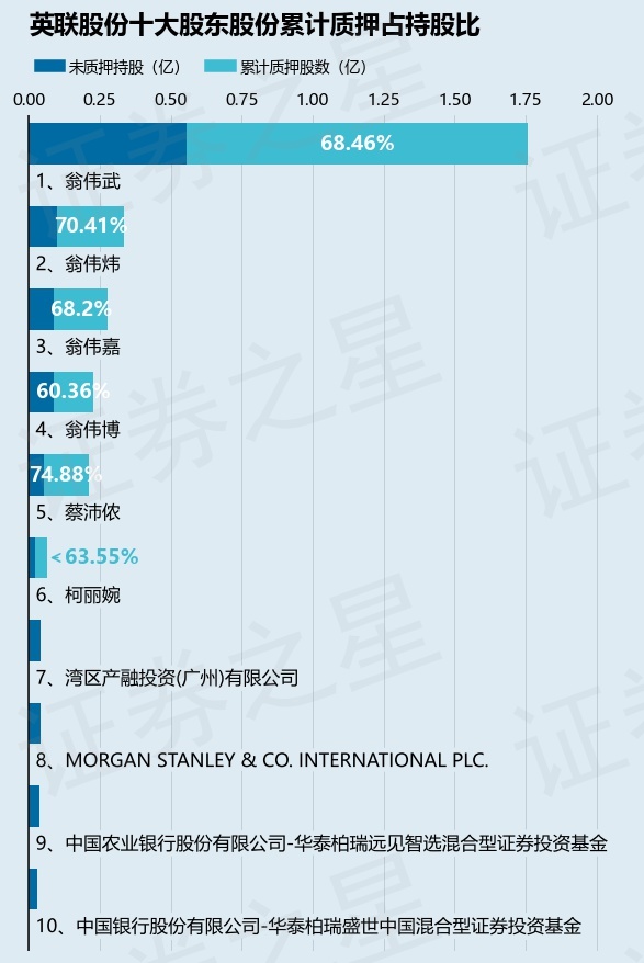 截止本公告日,股东翁伟武已累计质押股份1.2亿股,占其持股总数的68.46%,股东翁伟炜已累计质押股份2372.6万股,占其持股总数的70.41%,股东翁伟嘉已累计质押股份1906.6万股,占其持股总数的68.2%,股东翁伟博已累计质押股份1362.79万股,占其持股总数的60.36%,股东蔡沛侬已累计质押股份1574.4万股,占其持股总数的74.88%,股东柯丽婉已累计质押股份410.0万股,占其持股总数的63.55%。本次质押后英联股份十大股东的累计质押股份占持股比例见下图: