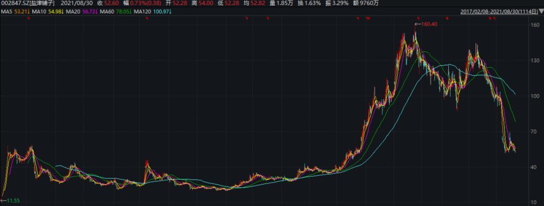事实上,今年以来,与业绩走低相对应,盐津铺子的股价总体呈现震荡下行态势,今年以来已累计下跌51.84%。截至8月30日收盘,盐津铺子报收于52.60元/股,已较2020年10月13日盘中触达的160.40元/股的历史最高点缩水67.21%,当前总市值为68.04亿元。