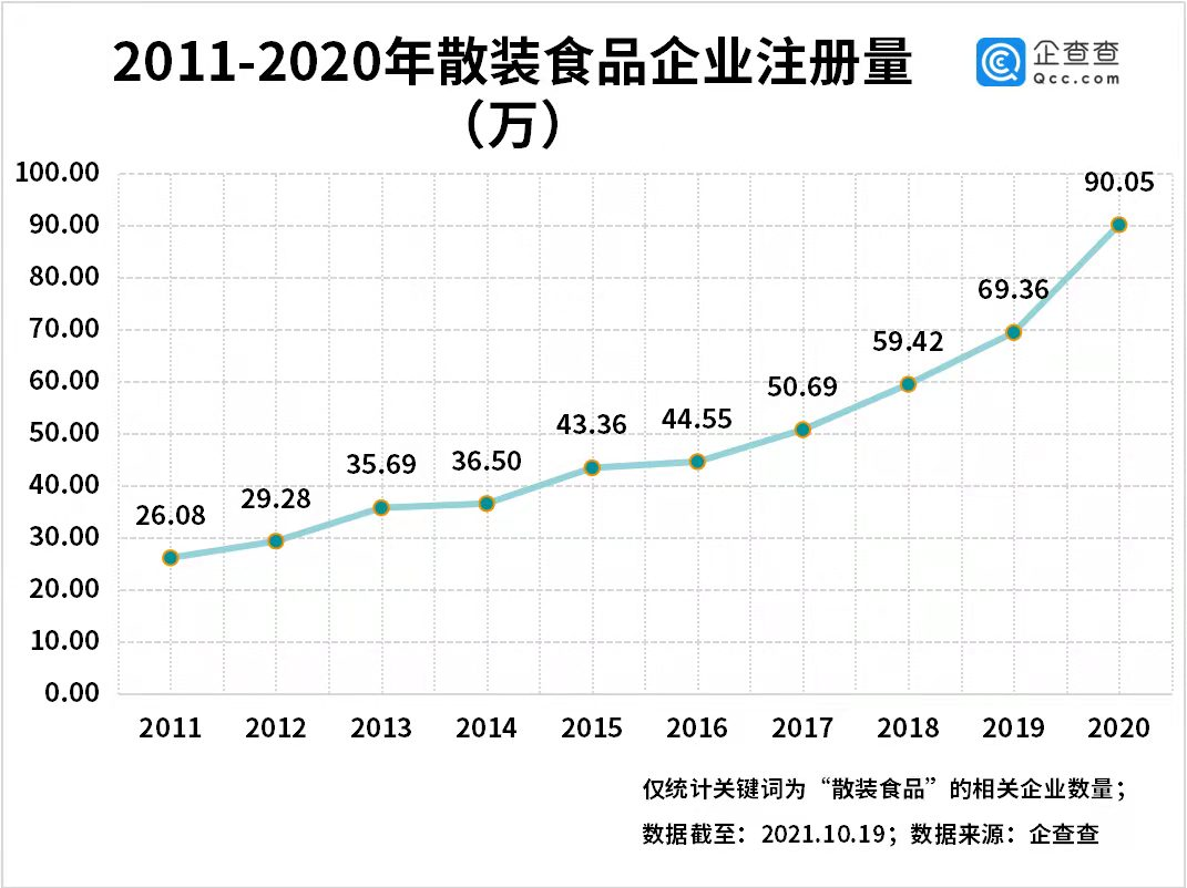 企查查数据显示,我国共有关键词为“散装食品”的现存企业651.93万家。2011年以来的十年间散装食品企业注册量逐年增长,2020年注册量超90万家,同比增长30%。