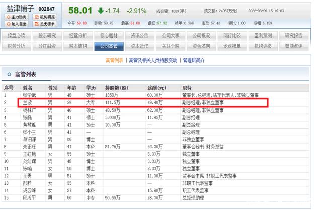 据东方财富网显示,兰波的薪酬为49.40万,低于公司另一副总杨林广的62万。但他持股111.5万,总体下来收益可观。