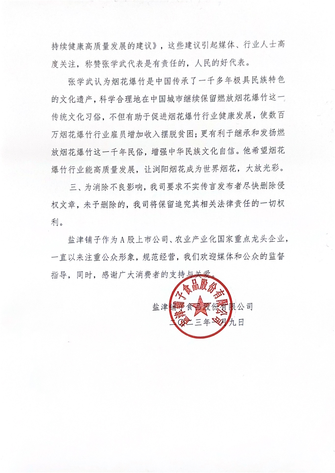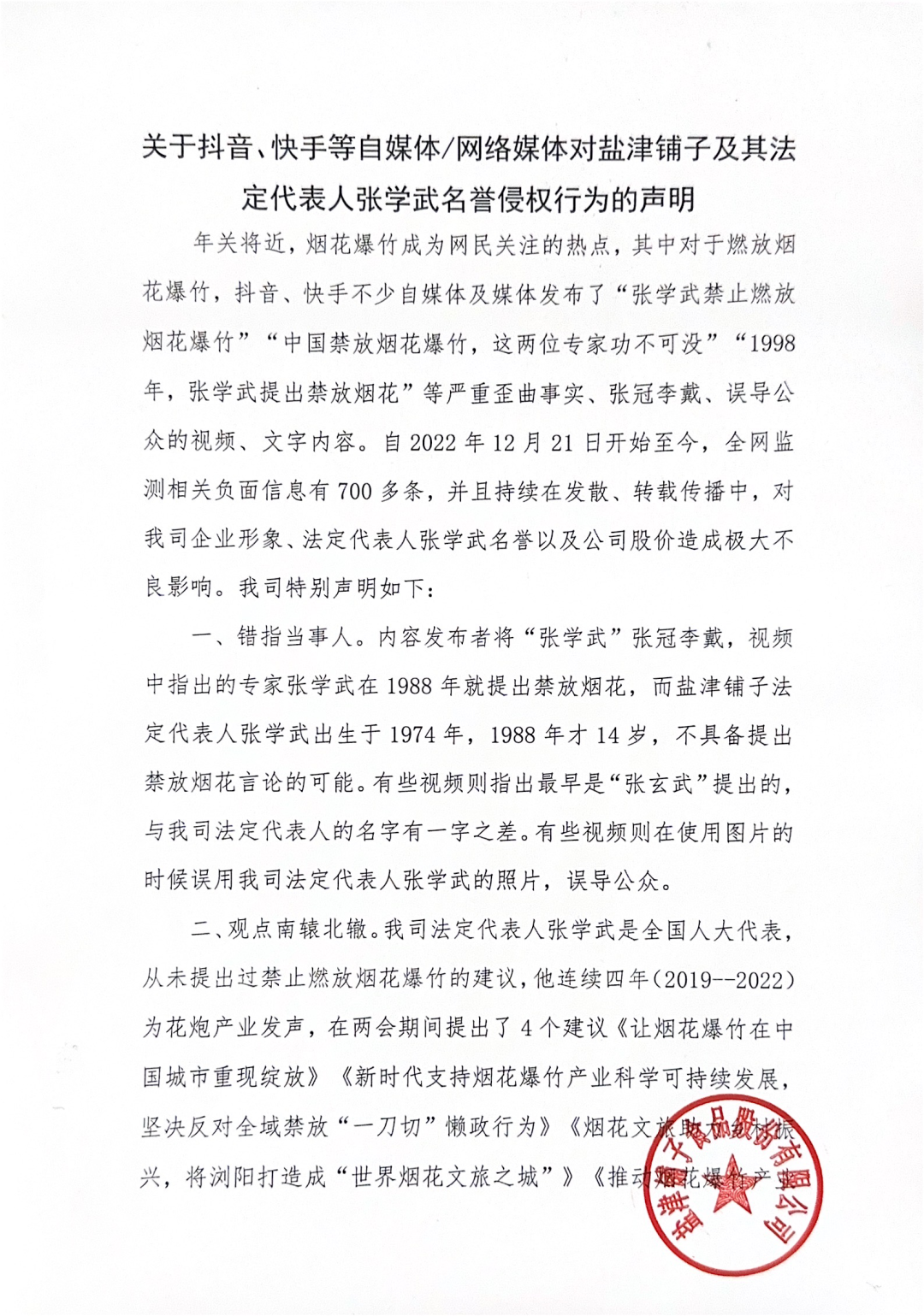 关于抖音、快手等自媒体/网络媒体对盐津铺子及其法定代表人张学武名誉侵权行为的声明