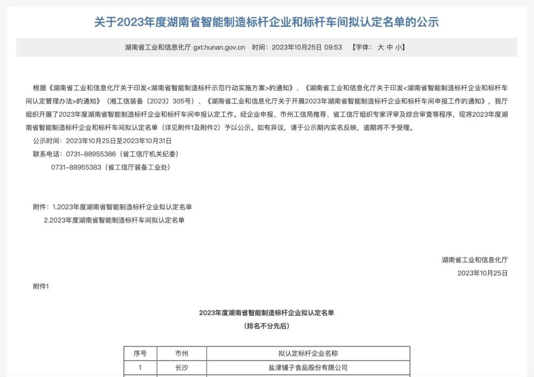 10月25日,湖南省工信厅发布2023年度湖南省智能制造标杆企业和标杆车间拟认定名单,共有来自全省智能制造优秀企业的13家企业和47个车间榜上有名,其中包括长沙5家企业和17个车间,盐津铺子上榜智能制造标杆企业。