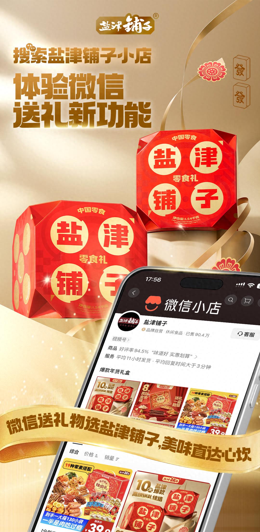 最近,微信小店推出了“送礼物”功能,盐津铺子迅速上线了礼物卡推广。现在,只需微信搜索“盐津铺子”进入小店,点击详情页中“送朋友”按钮,便可以用发红包的形式送出盐津礼物。