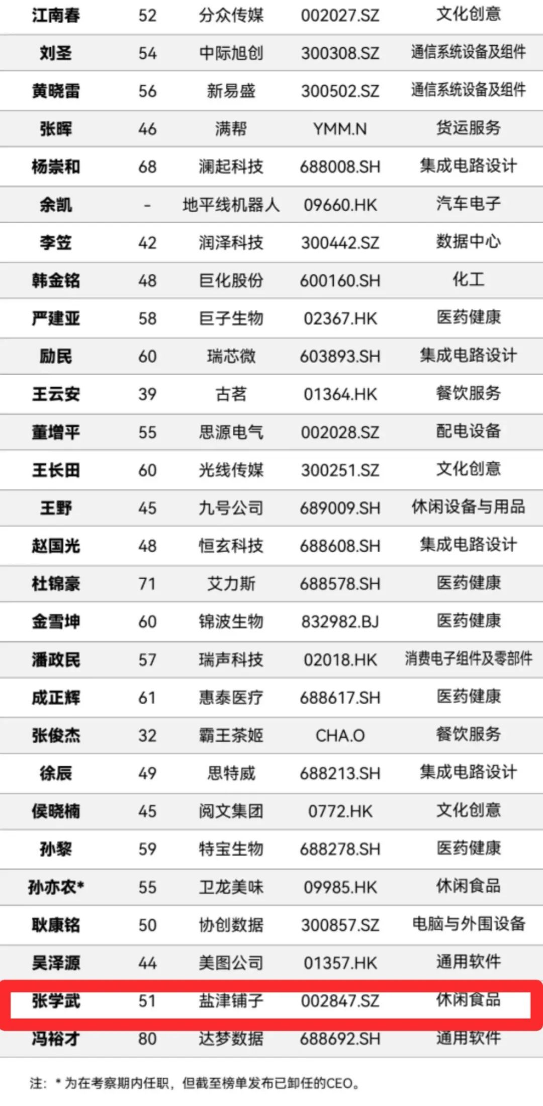 7 月 10 日,2025 福布斯中国最佳 CEO 榜单正式发布,盐津铺子张学武董事长荣登榜单。