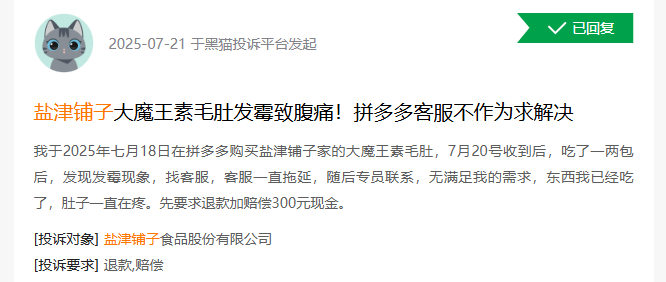 盐津铺子自主生产模式强调“品质可控”,但近年来其食品安全问题受到消费者关注。在黑猫投诉平台上,包含“盐津铺子”这一搜索词的投诉累计达768条。