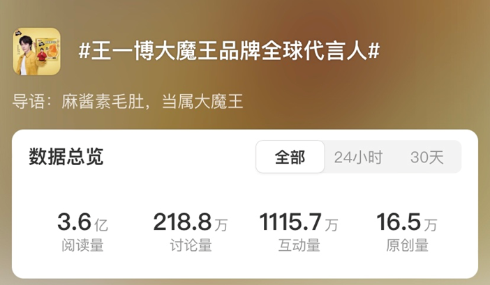 12月8日, 盐津铺子 (002847.SZ)宣布,演员、歌手王一博正式出任其子品牌“大魔王”的全球代言人。此次签约,距离该品牌今年三月邀请演员林一担任代言人尚不足九个月。