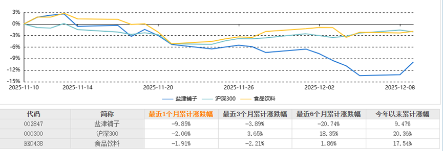 从股价表现来看, 盐津铺子 2025年至今累计上涨9.47%,整体走势相对活跃。然而,若观察更近期的市场表现,其股价呈现调整态势:近1个月、近3个月及近6个月的区间涨幅分别为-9.85%、-3.89%和-20.74%,该表现均落后于同期沪深300指数及食品饮料行业指数。