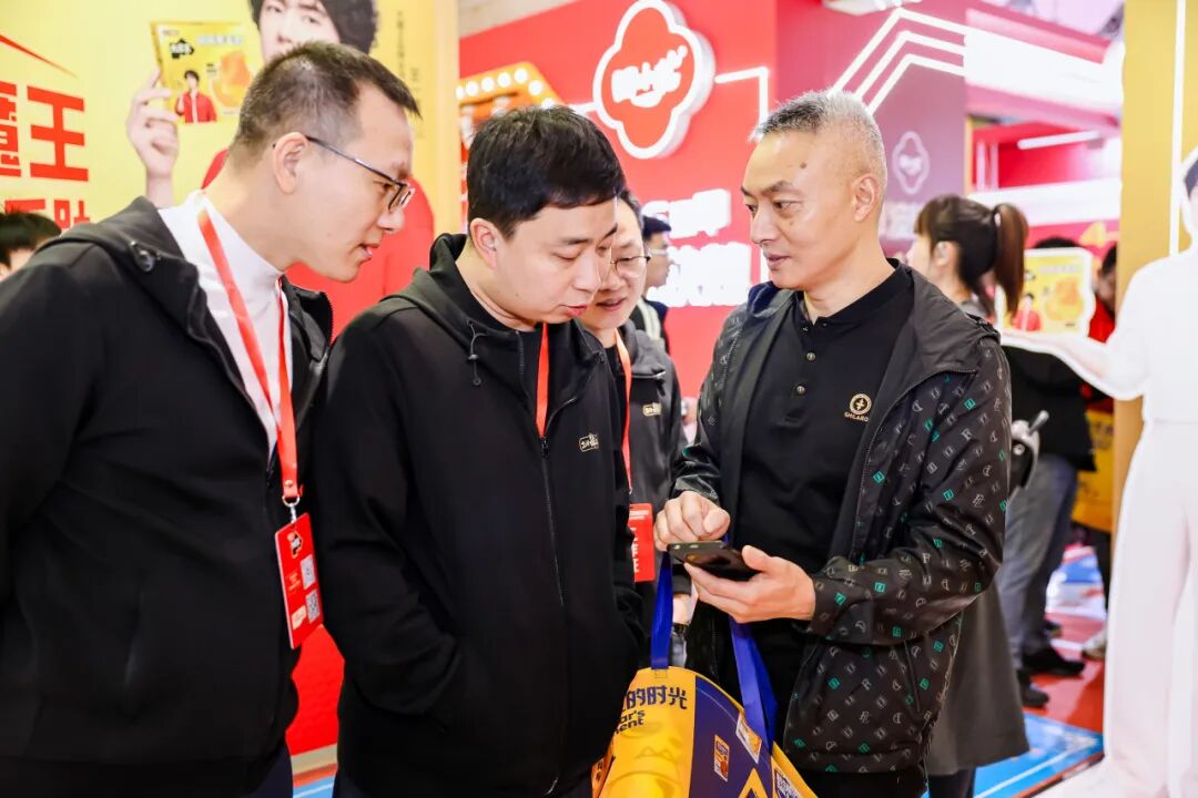 第 114 届全国糖酒商品交易会(春糖)的现场,盐津铺子展位前人潮涌动,前来咨询、品鉴的客商络绎不绝,洽谈区几乎座无虚席。大魔王系列产品集中亮相,新品麻酱串串王正式登场,与经典麻酱素毛肚、蒜蓉麻酱素毛肚组成「麻酱天团」,凭借地道口感收获众多经销商与消费者青睐。