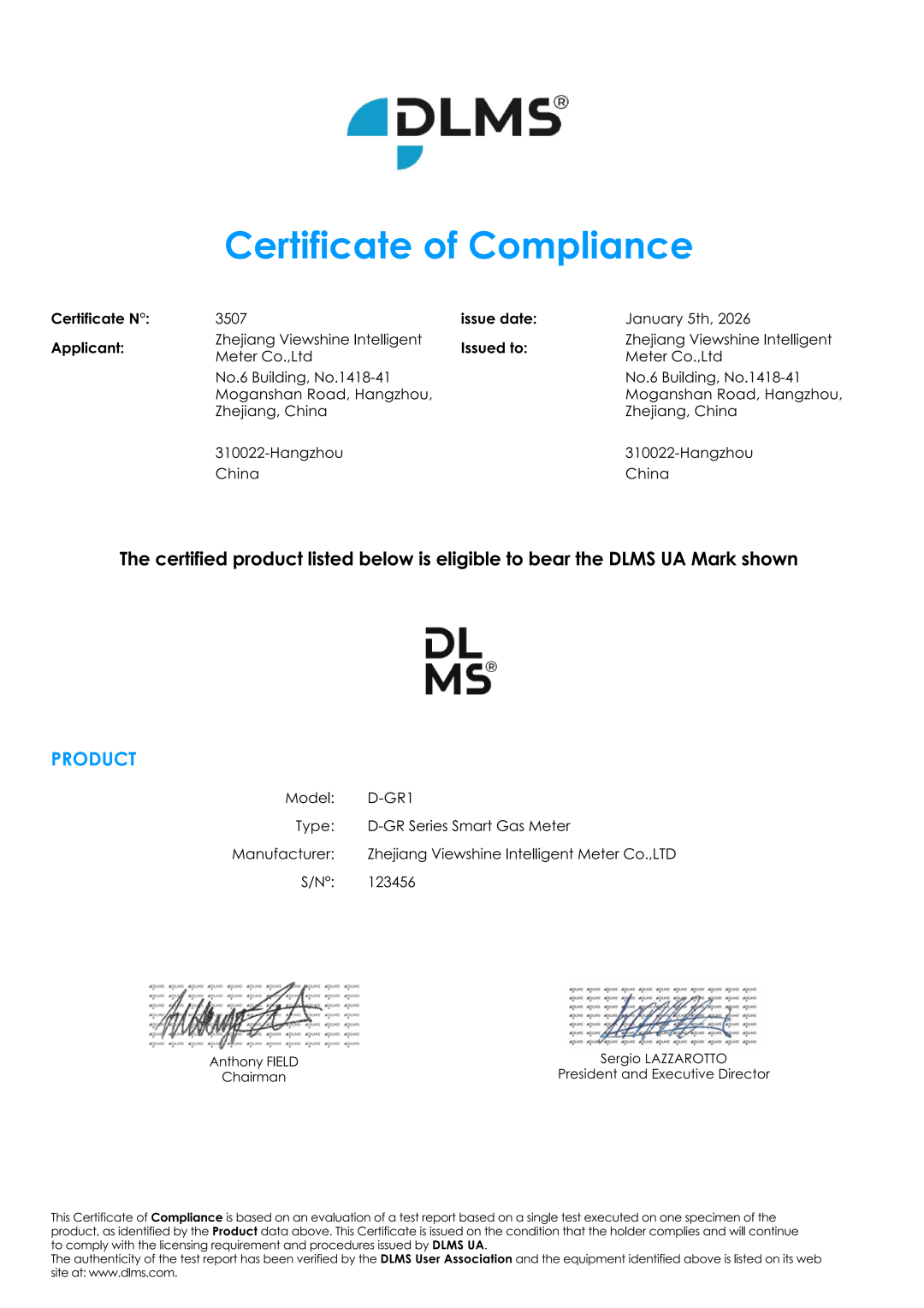 近日,威星智能自主研发的民用智能膜式燃气表D-GR1型,正式通过DLMS UA协会认证,获得DLMS/COSEM合规性测试认证证书。这标志着威星智能在智能计量领域的研发实力与产品标准化水平再次获得国际权威认可,为能源计量领域智能化升级提供了有力支撑!