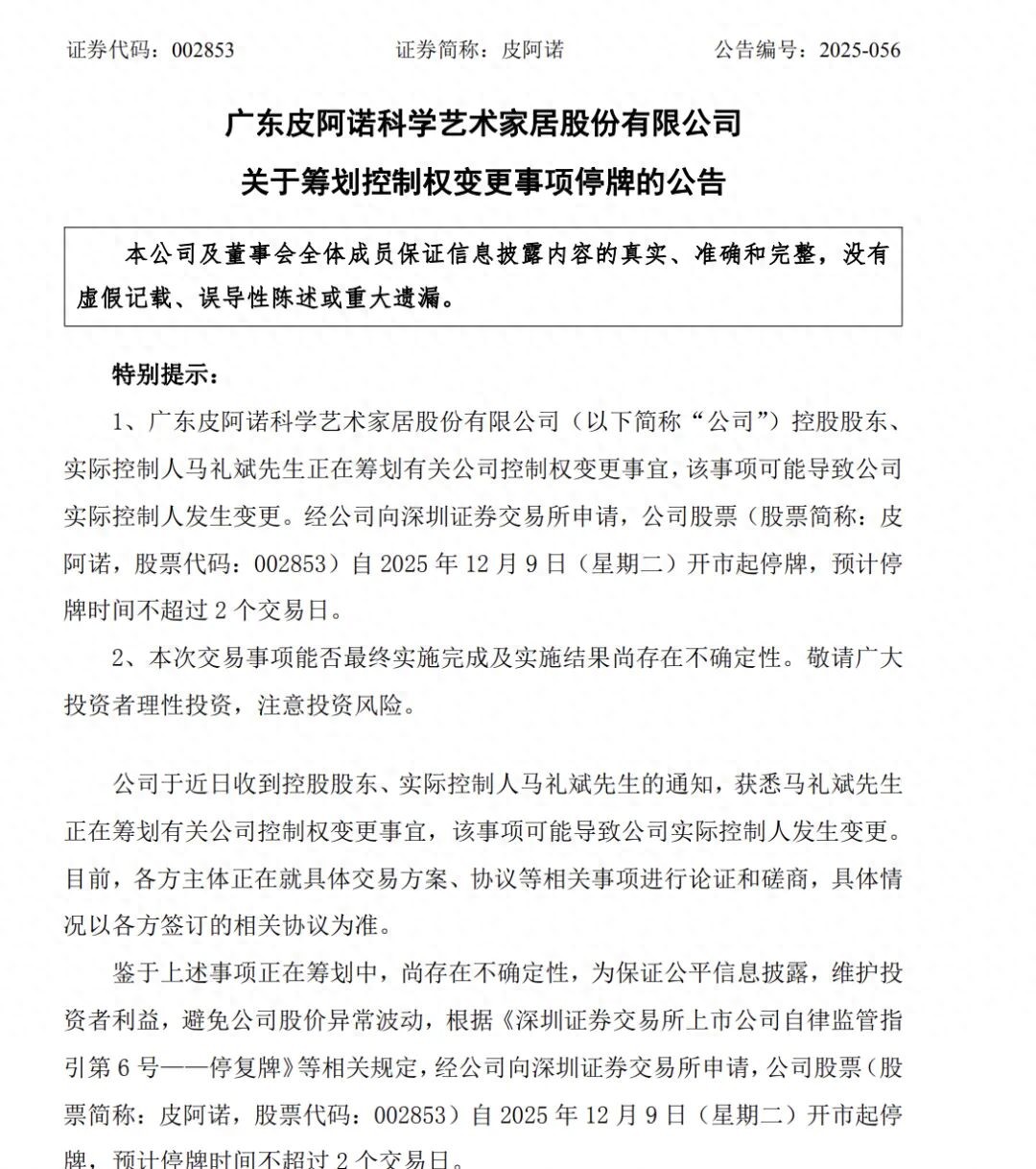 12月8日晚间, 皮阿诺 披露停牌公告,称公司控股股东、实际控制人马礼斌正在筹划有关公司控制权变更事宜。经申请,公司股票将于12月9日(星期二)开市起停牌,预计停牌时间不超过2个交易日。