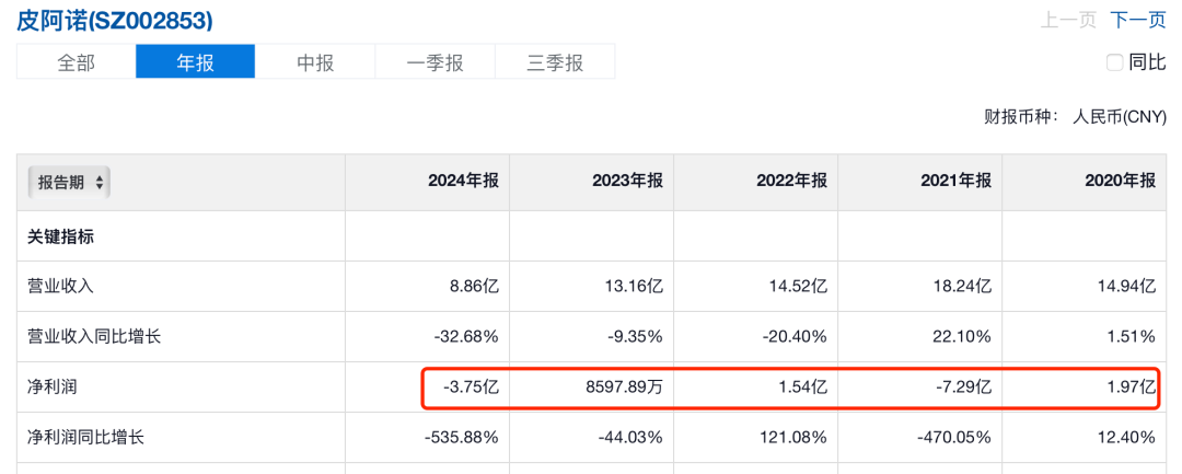 天津工厂变动的背后,是最近几年,皮阿诺的业绩受到挑战。今年以来,据皮阿诺披露的2025年一季度报、中报和三季度报,其营业收入分别为1.26亿元、2.68亿元和4.2亿元,分别同比下滑27.55%、40.65%和37.27%,已连续三期下滑。同期,其净利润分别为亏损396.37万元、1257.64万元752.52万元,连续三期均出现亏损。