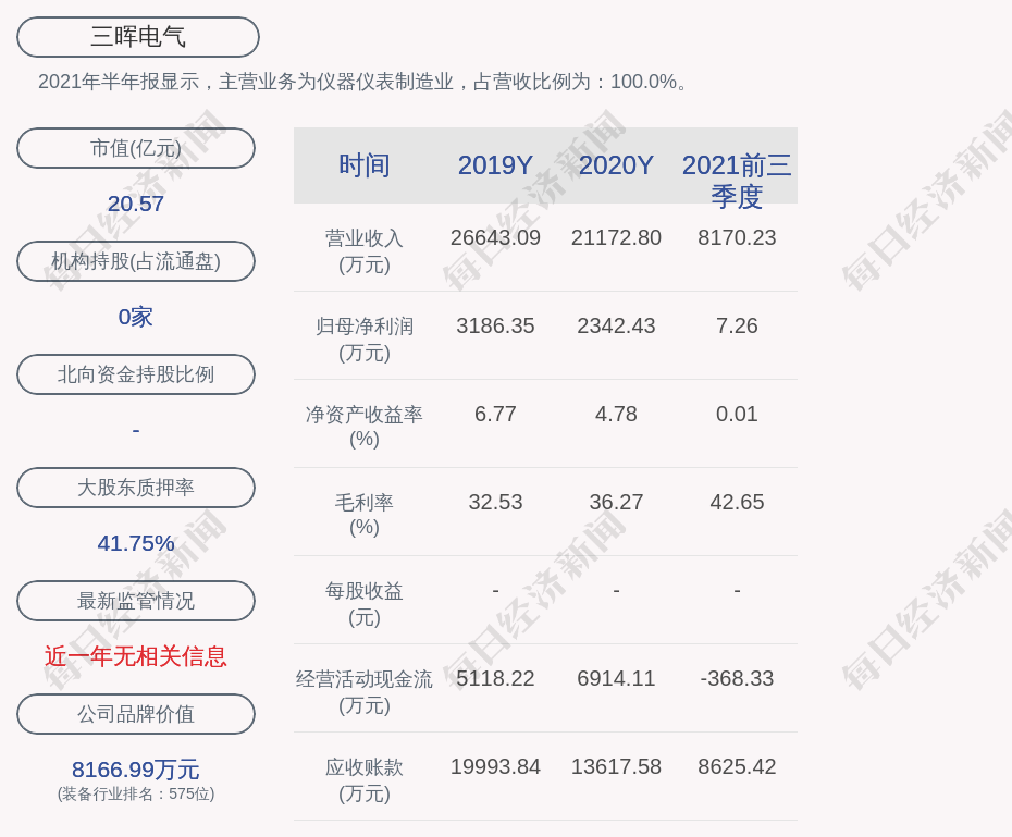 2021年半年报显示,三晖电气的主营业务为仪器仪表制造业,占营收比例为:100.0%。