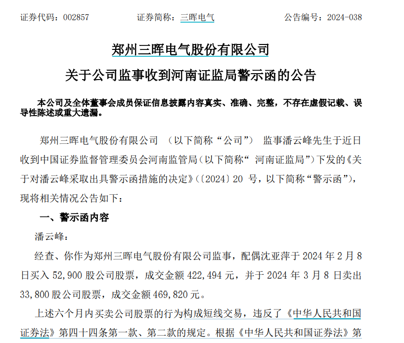 4月25日,三晖电气公告,因配偶买卖公司股票,构成短线交易。监事潘云峰近日收到中国证券监督管理委员会河南监管局下发的警示函。