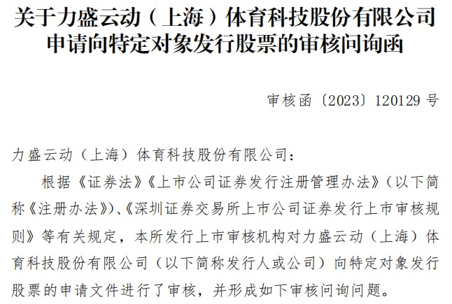力盛体育昨日晚间公告称,公司因定增6亿元遭深交所问询,要求就公司业绩变化、募投项目具体情况等予以说明。